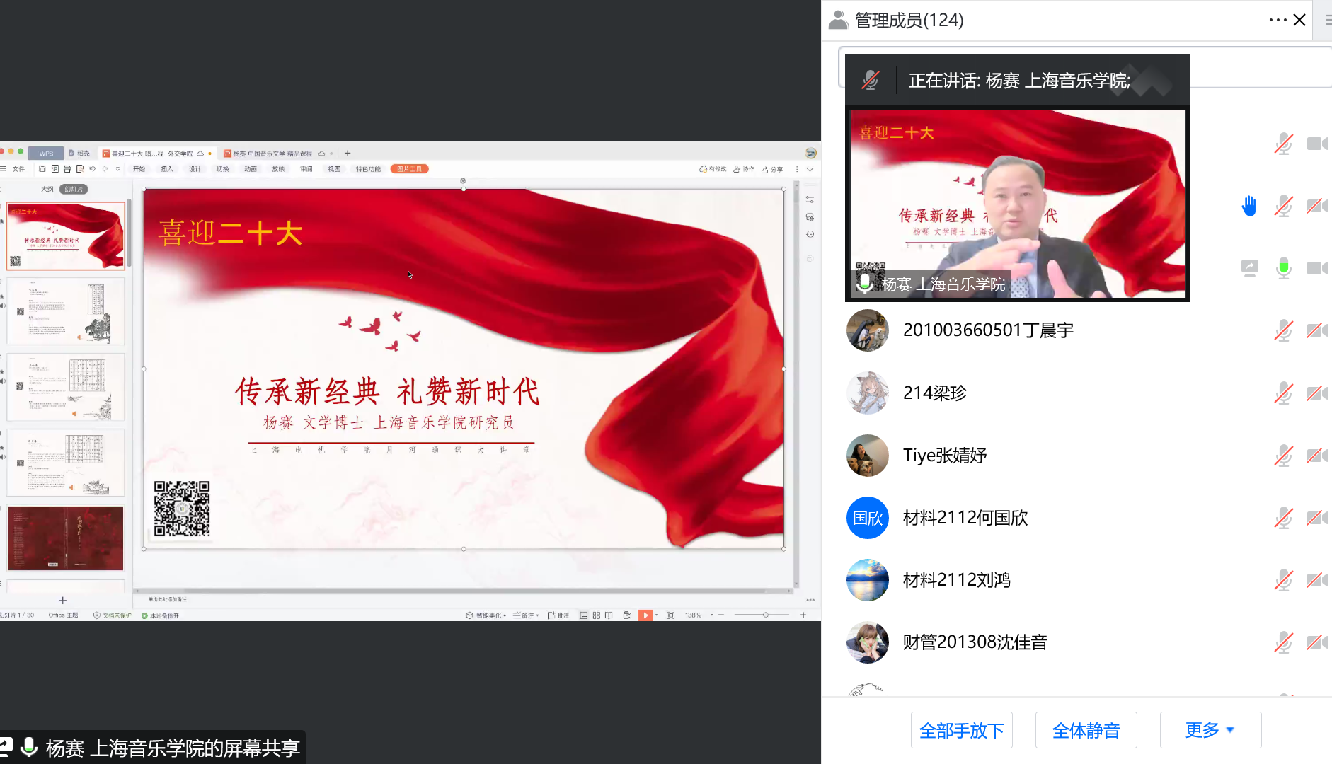 在喜迎党的二十大、喜迎校庆70周年之际,“月河通识大讲堂”本学期首场讲座于1011日开讲,由上海音乐学院研究员杨赛作题为《传承新经典,礼赞新时代——时代主旋律与艺术创作》的专题讲座。讲座由德赢AC米兰承办、吉文斌教授主持,设现场主会场及线上会场,全校近200名师生沉浸其中,在传统音乐和当代主旋律艺术作品里,触摸时代力量、感受创作初心、汲取文化动力。