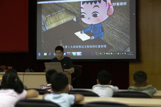 活动伊始,由小组成员王施菁放映讲解“小萝卜头”的故事。“红色历史永留传,爱国信仰更坚强”,号召小朋友向“小萝卜头”学习,困难面前,信念不摇;风雨面前,希望不熄,牢记苦难昨天,珍惜幸福今天,建设美好的明天。“红色经典永传唱,爱国歌声更嘹亮”,小组成员童胜哲领唱歌曲红星闪闪,台下很多小朋友跟着轻轻唱和,温柔的音符就如一束束闪烁的星光,照亮心房,点亮信仰。