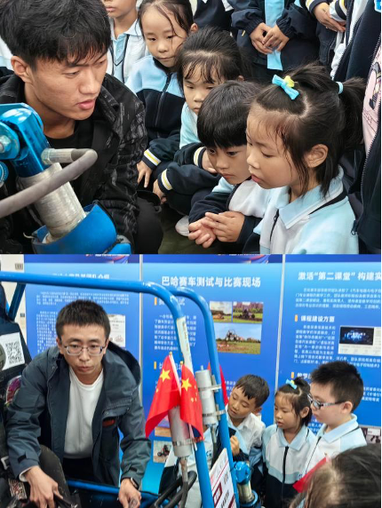 到达巴哈赛车实训基地后,赛车独特的造型和外观设计瞬间吸引了小学生们的目光。大学生们热情地迎接了这群小客人,并充当起了专业的讲解员,深入浅出地向小学生们讲解了巴哈赛车的车辆结构,从坚固的车架到灵活的悬挂系统,从强大的动力装置到转向机构,生动形象的展示在孩子们面前。他们生动有趣地绍了各个零件的名称、功能以及相互之间的协同运作,让孩子们对赛车这一复杂而又神奇的机械装置有了初步的认识。孩子们纷纷围拢在赛车周围仔细观察每个细节,有的孩子甚至蹲下来,轻轻地触摸着轮胎和车身,与它进行着一场无声的对话。讲解过程中孩子们不时地提出各种天真无邪又充满思考的问题,大学生们耐心地解答,互动氛围热烈而融洽。