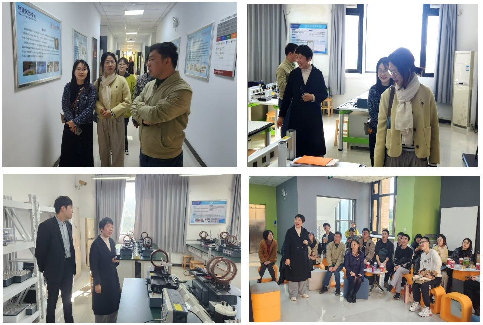 随后,大家参观了新近完成改造的学校物理实验中心,物理教研室主任金华老师、物理实验中心主任陈国红老师详细介绍了学校物理学科实验研究条件,以及大学物理课程和实验教学开展情况,使博士团同学们真实体验了未来入职高校的职业场景。