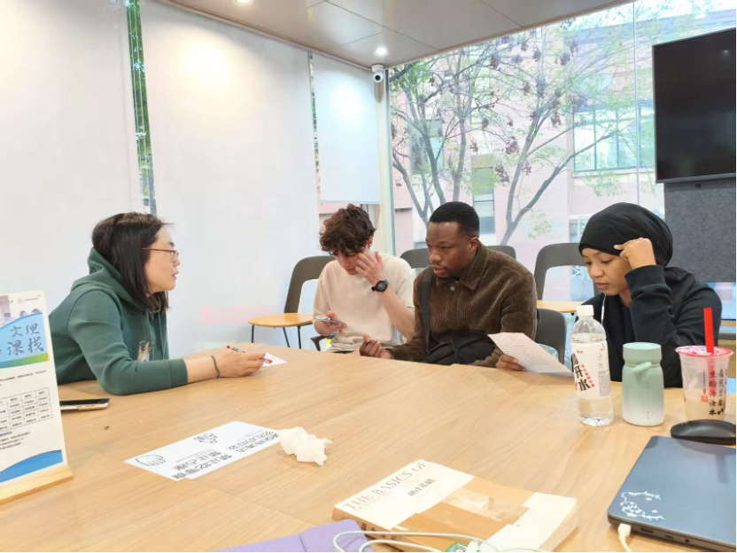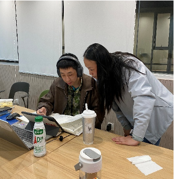 人文美育教研室王圆圆老师给留学生辅导中文的诵读写