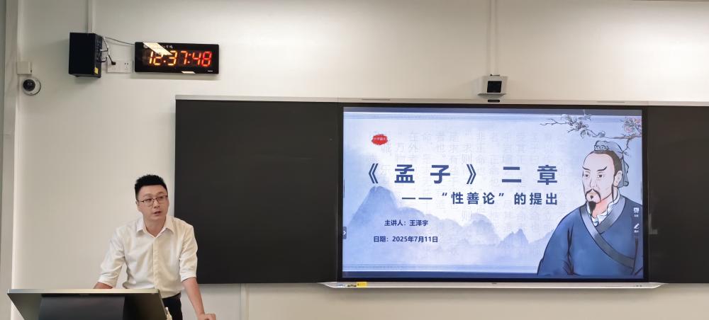 人文思政组王泽宇老师带来了《大学语文》中的“《孟子》二章”,通过“孺子喻”“觳觫喻”和“萌芽喻”三个譬喻完成性善论的起源与内涵的探讨。讲述过程中围绕“四心”展开,事例具体生动、逻辑清晰递进,在问答互动、循循善诱中层层深入,便于学生理解。