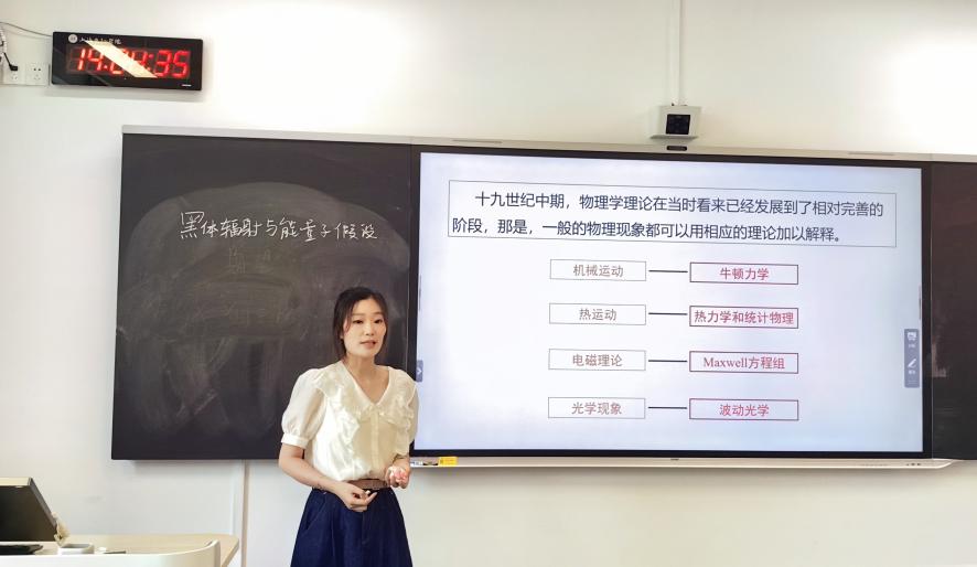 自然科学基础组梁盼老师的《大学物理》的“黑体辐射与普朗克能量子假设”。授课过程中PPT和板书采用思维导图的方式呈现,增强了学生对本节课知识体系的理解。在教学过程中,通过多次提问激发学生的思考。